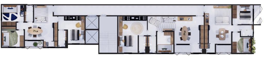 São 11 apartamentos padrão, com metragens de 50,74 m², 61,16 m² e 66,17 m², além de um duplex exclusivo no terceiro pavimento com 91,01 m². Todos os layouts foram desenvolvidos de forma inteligente, aproveitando cada espaço ao máximo, sem abrir mão do bem-estar. A estrutura conta com elevador, escadas, portão automático e duas áreas de subsolo para garagem.