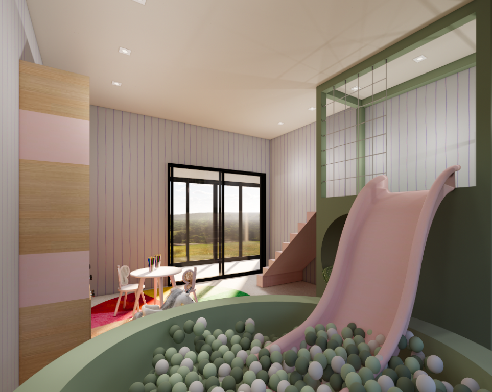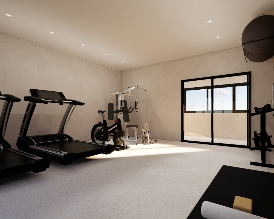 No térreo, o projeto ganha vida com espaços que fazem diferença no dia a dia: hall de entrada, wash dog, espaço da beleza, coworking, brinquedoteca, academia e acesso vertical. Nos fundos, um salão de festas completa a área comum, ideal para encontros e momentos especiais.